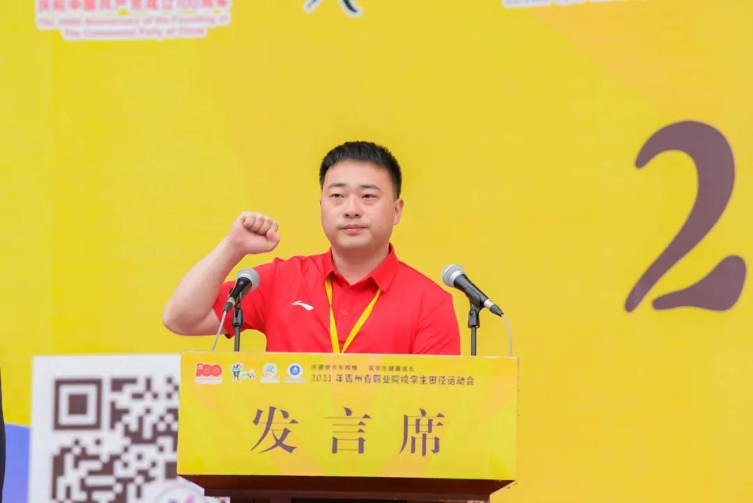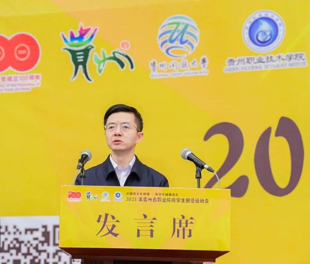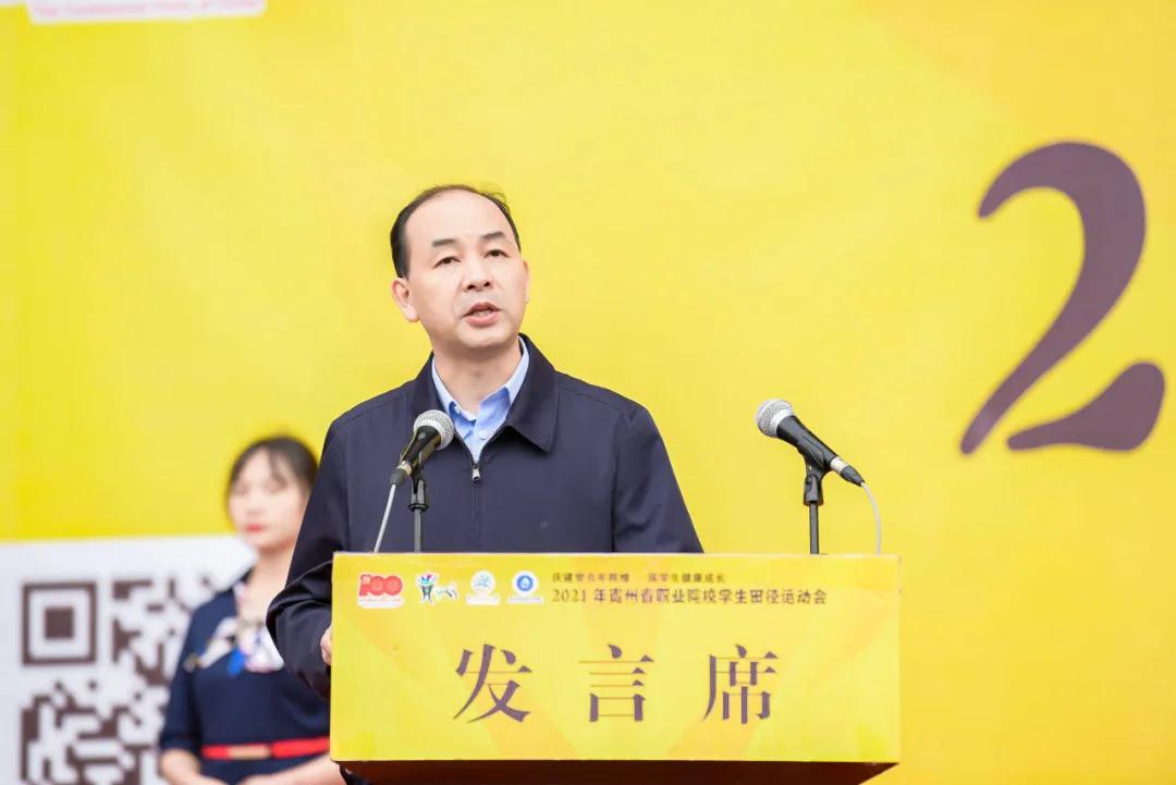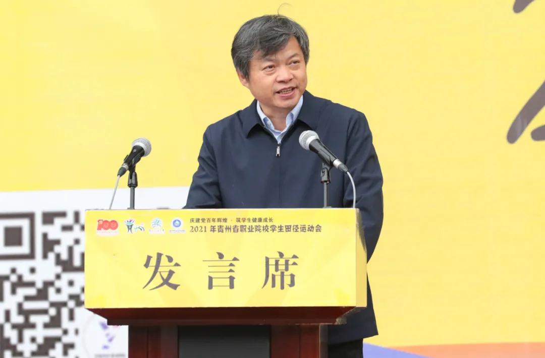 贵州省教育厅一级巡视员鞠洪讲话。他指出,党的十八大以来,以习近平同志为核心的党中央高度重视学校体育工作,提出了培养德智体美劳全面发展的社会主义建设者和接班人的总体要求。他强调,本次运动会阵容强,充分体现了学校体育之美、职业教育之美、体教融合之美、激扬青春之美。他希望,全省各级各类职业院校要以此次运动会为契机,深入贯彻习近平总书记关于职业教育的重要指示精神,围绕“人人职教、个个就业、家家致富”新的历史使命和奋斗目标,积极适应类型教育,把学校体育工作抓紧抓牢抓实,切实履行好促进学生健康成长的职责,共同奏响新时代职业院校体育奋进之歌。鞠洪巡视员宣布“2021年贵州省职业院校学生田径运动会”开幕。