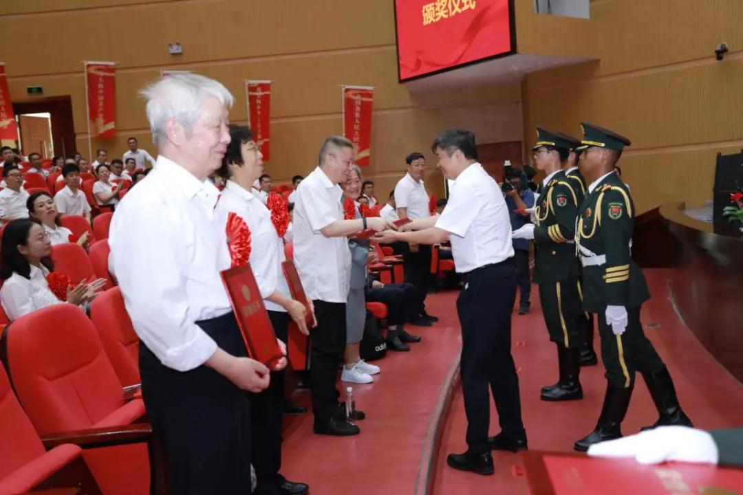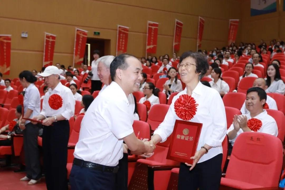 党委书记王爱华,党委副书记、校长汤健为离退休党员获奖代表颁奖。
