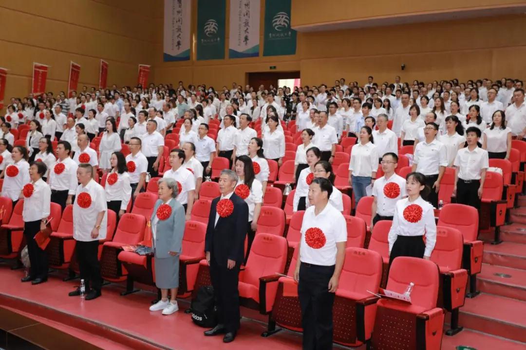 党委书记王爱华在讲话中代表学校党委向受到表彰的114名先进个人、26个先进集体表示热烈祝贺,并向全校共产党员和党务工作者致以节日的问候。王爱华书记表示,今天在此集会深入学习贯彻习近平总书记在庆祝中国共产党成立100周年大会上的重要讲话精神、认真学习省委书记谌贻琴同志在贵州省庆祝中国共产党成立100周年大会上讲话的讲话、共同追忆党走过的100年艰辛而辉煌的风雨历程、共同见证100年举世瞩目的辉煌成就,这即是党史学习教育的一次专题宣讲和专题党课,也是“学党史、悟思想、感党恩、知行合一、抢抓发展”的专题思政课。目的就是进一步激励和动员全校各级党组织、党员、干部和教职工,弘扬伟大的建党精神和脱贫攻坚精神,弘扬新时代贵州精神,坚定信心,振奋精神、开拓创新、锐意进取,共同谱写学校高质量跨越式发展恢弘篇章。