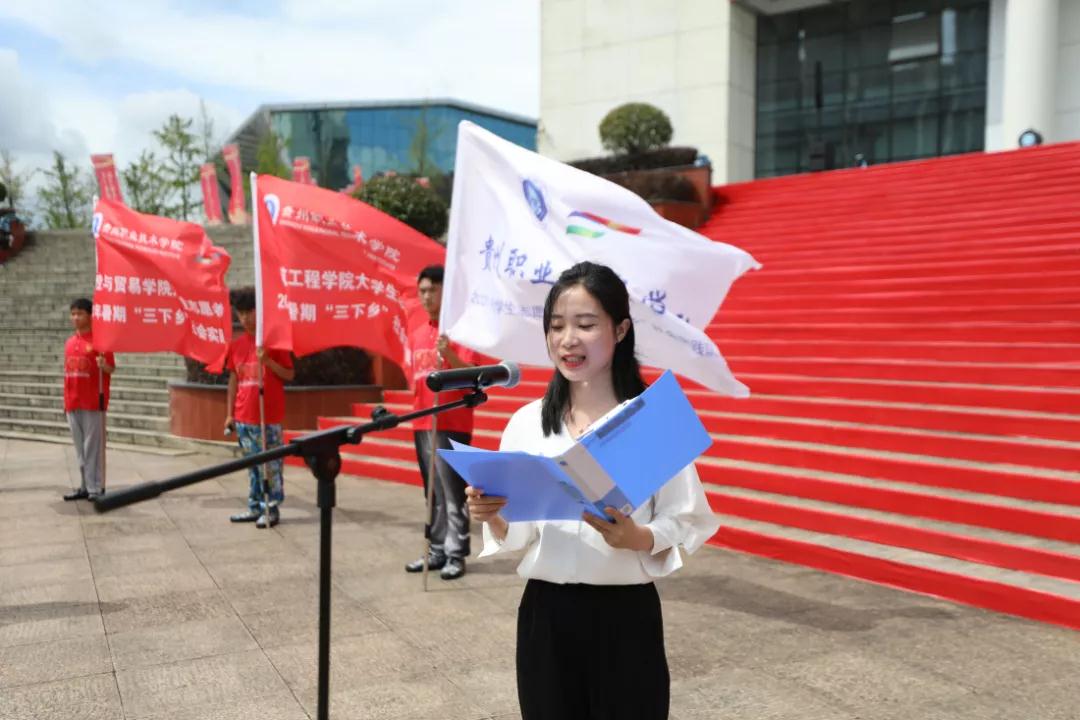 校团委副书记李雪芬宣读《关于公布贵州职业技术学院2021年暑期“三下乡”社会实践活动立项团队名单的通知》。实践队员代表杨帅同学与荣获2020年暑期“三下乡”“全国优秀实践团队”的指导老师姚丹青先后发言:对即将投身暑期社会实践活动感到激动,同时承诺将全力以赴,力争圆满完成预定的各项实践任务,在基层展现风采,奉献智慧,贡献力量。