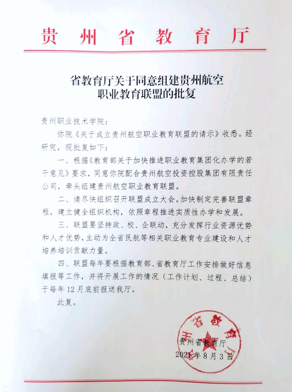 8月3日,省教育厅批复由贵州职业技术学院配合贵州航空投资控股集团有限责任公司牵头组建贵州航空职业教育联盟(以下简称“联盟”)。“联盟”的组建是全面贯彻习近平总书记对职业教育工作作出的重要指示精神,认真落实《关于深化产教融合的若干意见》《职业教育提质培优行动计划(2020—2023年)等文件要求,优化职业教育类型定位,深化产教融合、校企合作,深入推进育人方式、办学模式、管理体制、保障机制改革的有力举措。