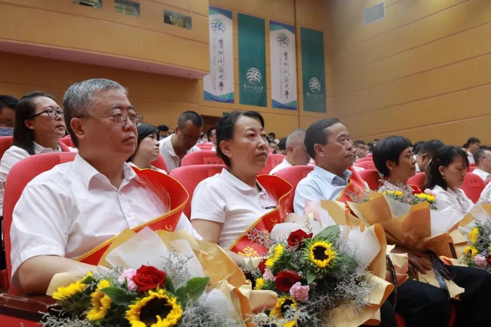 表彰大会上,党委副书记龚辉宣读表彰决定,充分肯定了受表彰教师们对学校教育教学工作做出的贡献,引导全体教职工以先进为榜样,积极探索新时代教育教学方法,不断提升教书育人本领。郭知涛等37位教师代表上台接受了荣誉表彰,学生代表用鲜花表达了对老师们诚挚的谢意和节日的祝福。