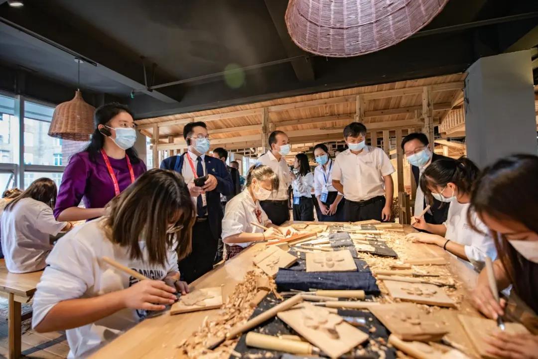 驻足古法营造实训基地,极富有视觉效果的侗族鼓楼格外惹眼,由贵州侗族花鼓楼非遗传承人杨应琪、顾学尧大师带领工作室同学制作的鼓楼、吊脚楼、斗拱等等百余件模型让参访团耳目一新。该基地已通过现代学徒制育人模式培养了一支懂古法营造、懂土建、懂专业的民族民居建筑保护与传承工匠,在参与服务美丽乡村建设和古村落保护中践行着“人人职教、个个就业、家家致富”的职教使命。2021年,古法营造实训基地拓展成为贵州省非物质文化遗产博览馆实训基地、贵州省非物质文化遗产保护中心实训基地。参访团人员对“非遗”进校园育人模式颇为认同,纷纷与基地教师交流互鉴。