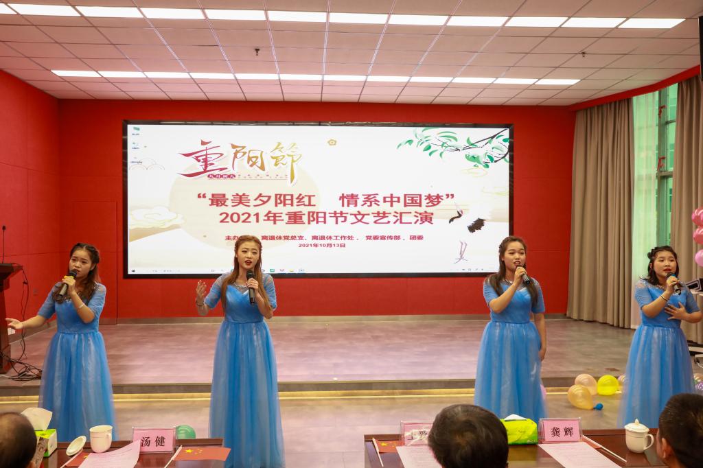欢歌笑语庆重阳,载歌载舞颂党恩。2021年10月13日下午,离退休党总支(处)、党委宣传部、校团委联合在八鸽岩路校区远程综合大楼3楼报告厅组织了“最美夕阳红·情系中国梦”2021重阳节庆祝活动。学校党委书记王爱华、党委副书记、校长汤健、党委副书记龚辉、纪委书记骆最勇、副校长汪红、党委委员何滨和各党总支书记及相关职能部门负责人出席活动,与离退休老同志们欢聚一堂,共同庆祝中国传统节日重阳节。