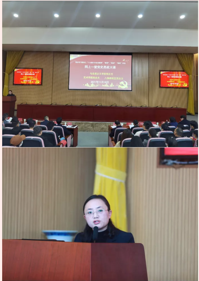为进一步深化党史学习教育,及时把党的十九届六中全会精神融入思政课堂,马克思主义学院积极探索“多名教师同台、多个班级同课、职业教育与开放教育学生同听”的思政大课堂模式。2021年11月18日下午14:30,马克思主义学院党总支与艺术学院党总支、八鸽岩校区党总支联合开展党史学习教育之“党的十九届六中全会精神”“联学”“联讲”“联教”集体备课活动。学校党委书记宋广强教授,党委副书记、校长汤健教授,党委副书记龚辉教授,党委委员、副校长汪红教授,党委委员、宣传部何滨部长,艺术学院党总支、八鸽岩校区党总支领导和党员教师参加。活动由马克思主义学院党总支副书记、院长程守艳老师主持。
