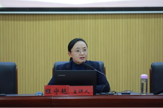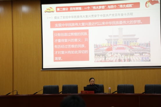 为深入学习贯彻习近平总书记在庆祝中国共产党成立100周年大会上的重要讲话精神,更加全面、准确、深入认识习近平总书记重要讲话的重大意义、主要内容和丰富内涵,助力学校党史学习教育走深走实,融会贯通,内化于心,外化于行,按照省教育厅安排,11月26日晚,在行政楼九楼会议室,省教育厅宣讲团成员、马克思主义学院院长程守艳老师以《以史为鉴、开创未来》为题,为师生开展了一场深刻学习贯彻习近平总书记在庆祝中国共产党成立100周年大会上的重要讲话精神宣讲活动。
