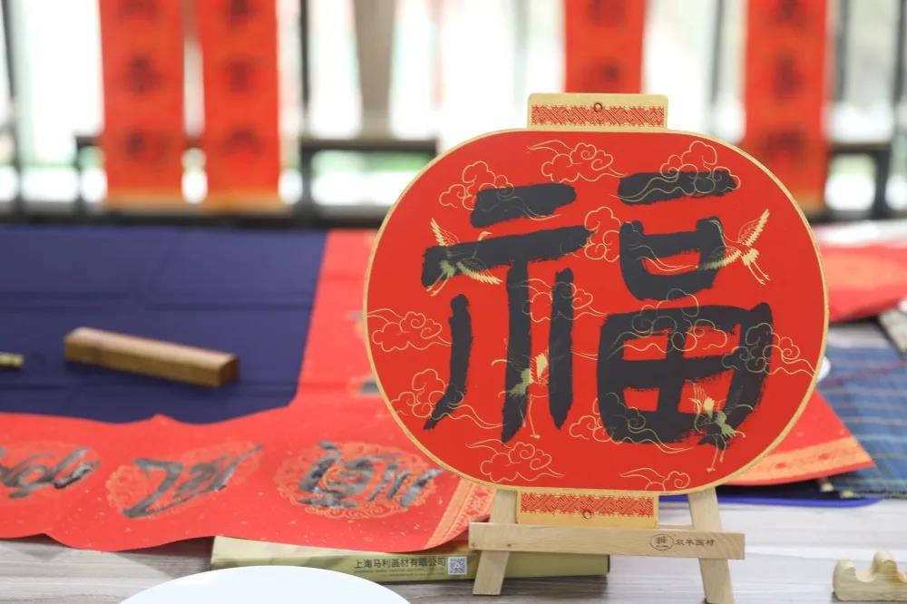 活动现场,汤健校长挥笔泼墨,一行行俊逸的书法,挥洒在一张张喜庆的红纸上,书写着一句句对新春的寄语与祝福。