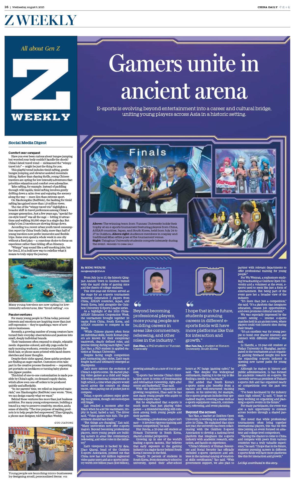 8月6日,中国日报旗舰版16版、国际版14版整版刊发Gamers unite in ancient arena(当电竞遇见古镇:中韩东盟Z世代选手在青岩“数字对决”)