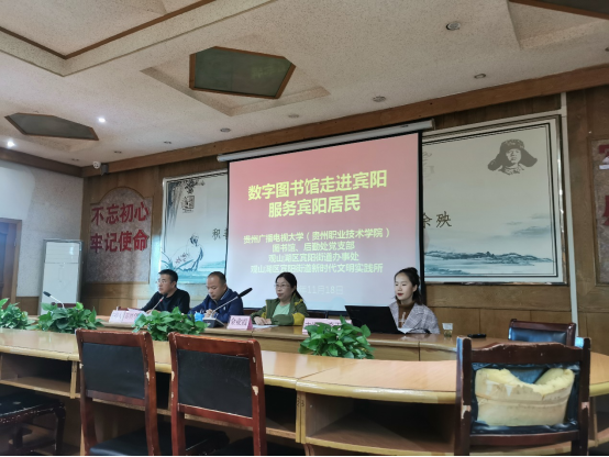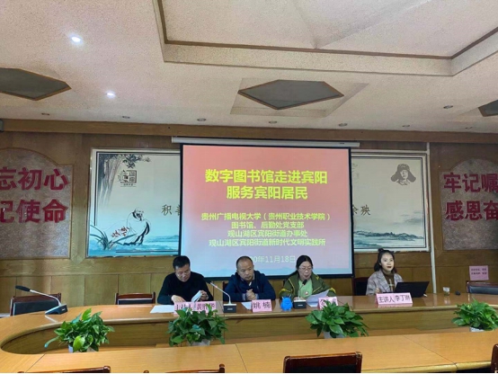 为进一步提高我校图书馆社会公共服务能力,拓展社会服务功能,丰富公共文化服务形式,推进全民终身学习活动开展,2020年11月18日上午,“贵州广播电视大学(贵州职业技术学院)数字图书馆走进宾阳街道、服务宾阳居民”活动在观山湖区宾阳街道办事处举行。本次活动由我校图书馆主办,后勤处与宾阳街道社区服务中心参与完成。学工部部长、图书馆副馆长姚楠,宾阳街道党工委副书记胡皓元,街道办事处相关领导,图书馆、后勤处相关人员及社区积极分子出席了此次活动。本次活动由宾阳街道社会事务服务中心主任黄胜华主持。