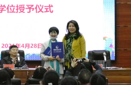 喻莉校长为获得学位的杨艳华同学颁发了毕业证书和学位证书。杨艳华同学还与大家分享了在读期间的“学会学习,学会适应,心态决定成败,向学位发起冲锋”的学习经验,让在座新同学获益匪浅。2021年春小学教育本科班吴旭梅同学代表新生发言表示,“时间是挤出来的,参加学习才能收获更多。”