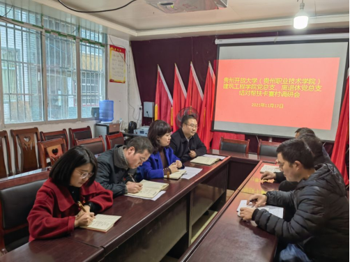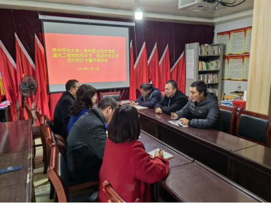 17日下午,在卡宴村村委会,建筑工程学院党总支书记罗之军、离退休党总支书记邓咏梅、贵州开放大学(贵州职业技术学院)驻卡宴村第一书记景玉华和卡宴村村支书、村民委员会主任、调研队员柳姚芳、李光筑召开专题调研座谈会。会上,邓咏梅、罗之军两位书记分别领学《党的十九届六中全会公报精神》《习近平关于乡村振兴战略重要指示批示精神》,就总结党的百年奋斗重大成就和历史经验的重大意义、党的百年奋斗和初心使命及乡村振兴重大战略指导精神等内容进行了重点阐释。景玉华对卡宴村基本情况进行了全面介绍,